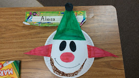 Students colored, cut, and glued pieces onto a paper plate to make an elf.